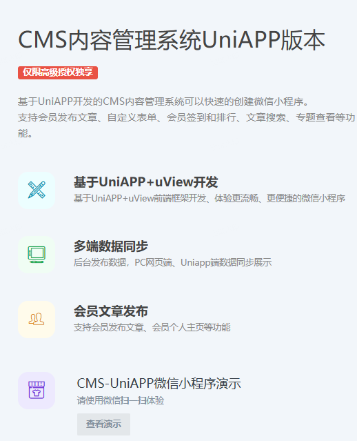 一款基于ThinkPHP+uniapp开发的内容管理系统,可自定义内容模型、自定义单页、自定义表单、自定义会员发布、付费阅读等功能,提供无加密源码,支持私有化部署。