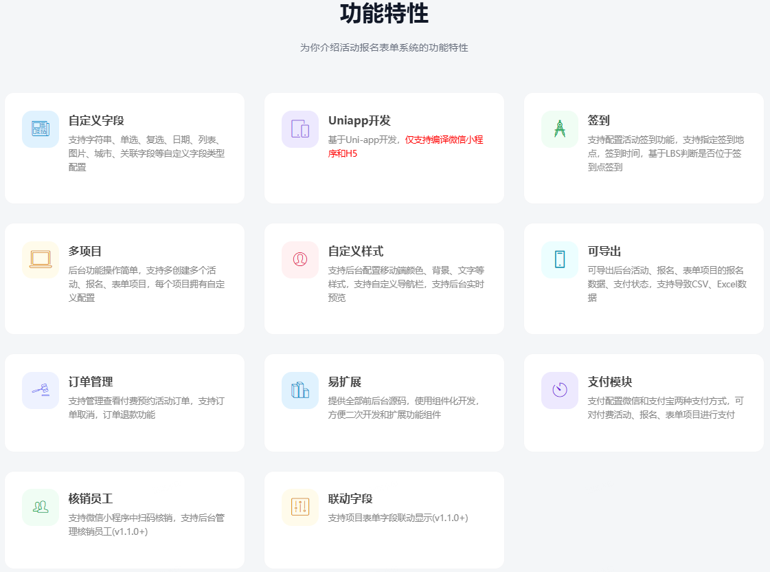 一款基于ThinkPHP+Uniapp+uView开发的活动报名表单系统,支持付费活动报名,支持自定义活动、报名、活动签到、活动核销、表单小程序,提供全部前后台源码,支持私有化部署。