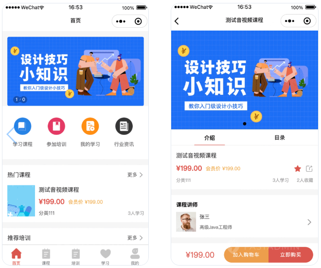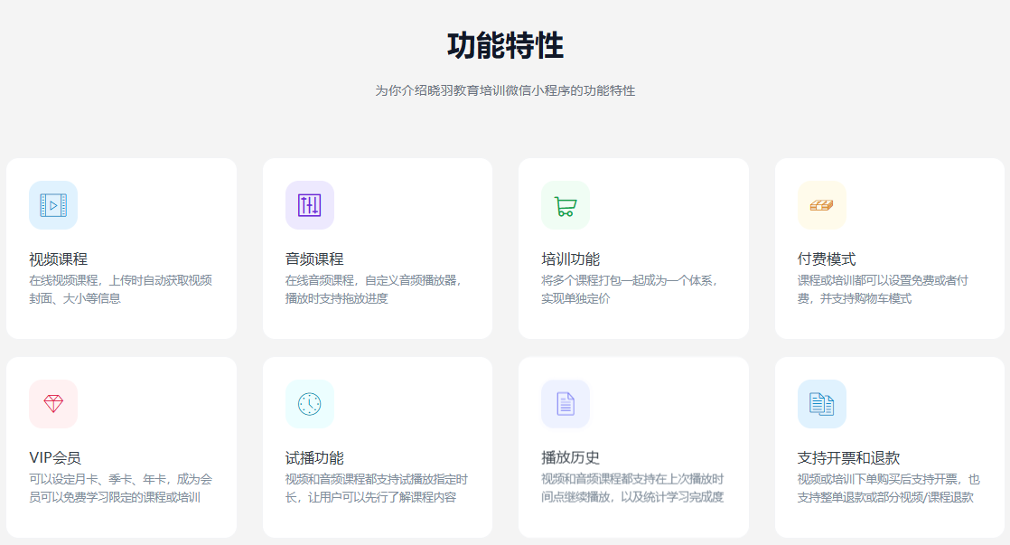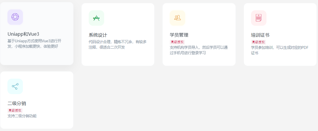 一款适用于企业或组织的教育培训微信小程序系统,基于ThinkPHP+Unipp开发,为继续教育、企业培训、考试学习等场景提供一站式音视频学习平台,支持课程购买、会员充值等方式进行在线付费学习,以及培训证书的生成与查证(高级授权)。