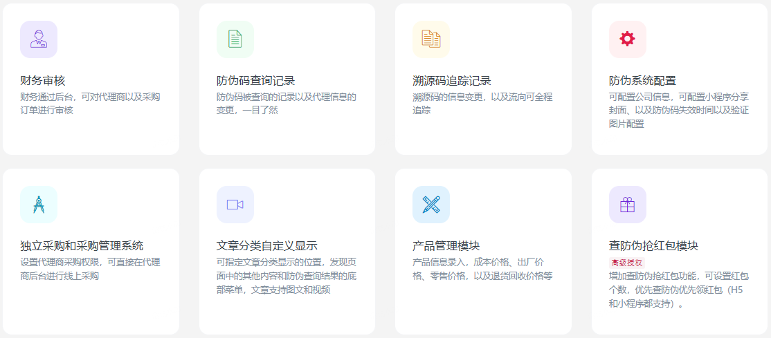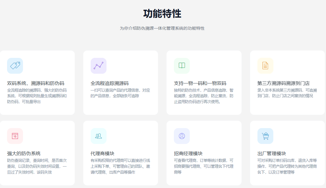 一款基于FastAdmin+ThinkPHP和Uniapp进行开发的多平台(微信小程序、H5网页)溯源、防伪、管理一体化独立系统,拥有强大的防伪码和溯源码双码生成功能(内置多种生成规则)、批量大量导出防伪和溯源码码数据、支持代理商管理端(团队管理、采购,邀请代理商、出库等功能)、支持招商经理管理端(可管理代理商团队,邀请代理商,数据统计,采购订单统计),支持出厂员端(出库、入库)、文章资讯、自定义展示查询页显示数据、查询记录、溯源记录追踪等功能。提供全部前后台无加密源代码和数据库,支持私有化部署。