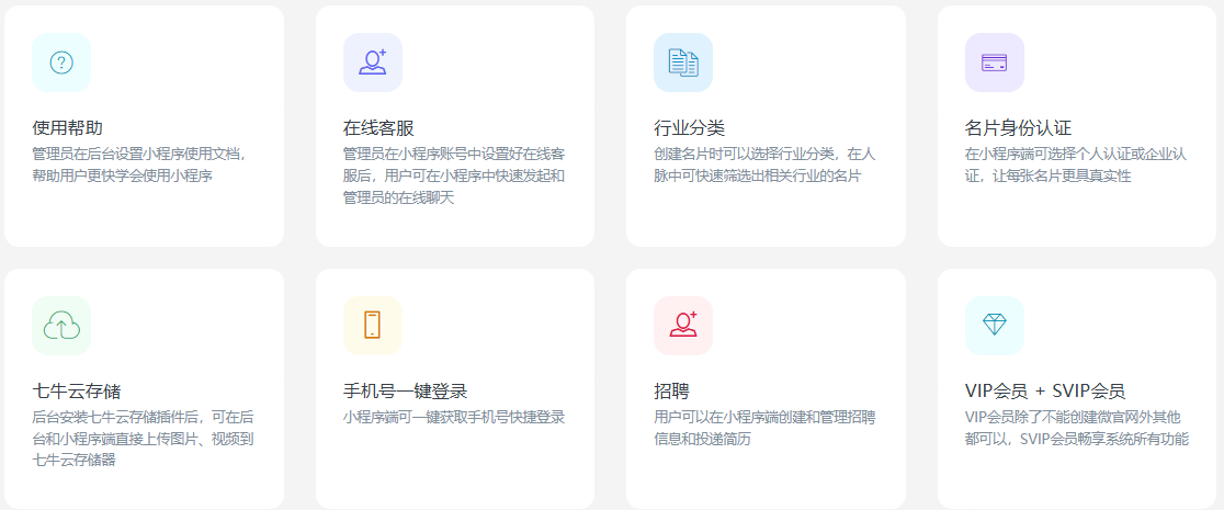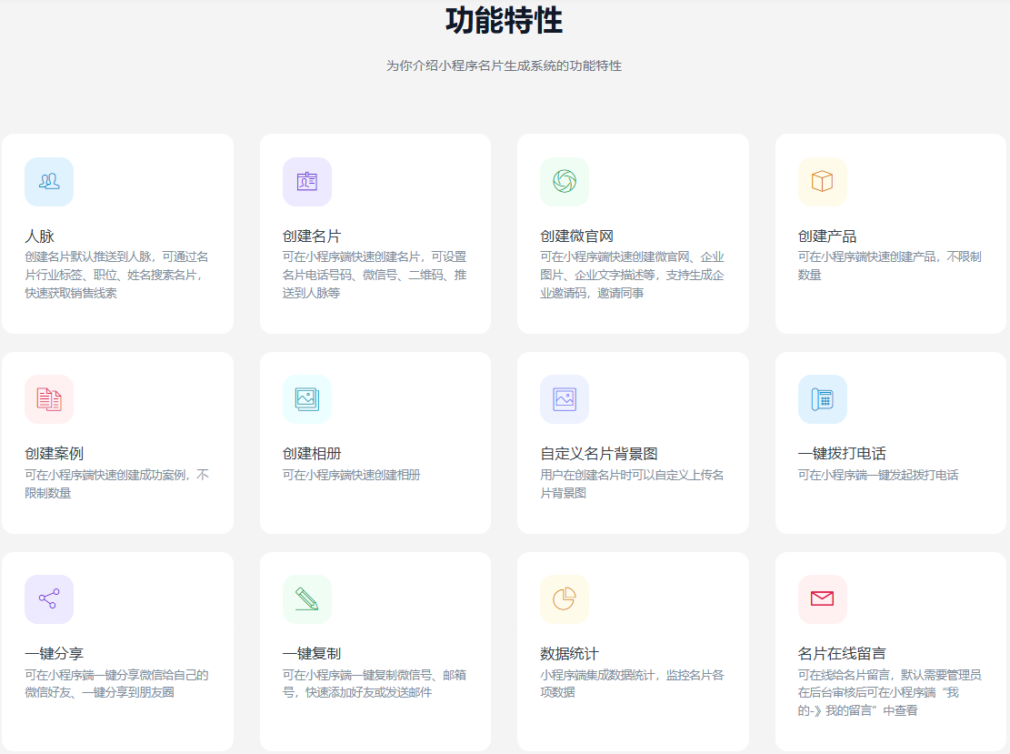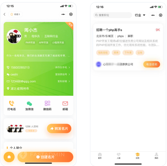 一款基于ThinkPHP+FastAdmin+原生微信小程序开发的可在线生成电子名片的微信小程序,包含微官网,上传产品、成功案例、相册、一键拨打电话、一键复制微信号、数据统计等。