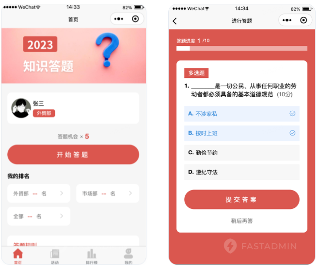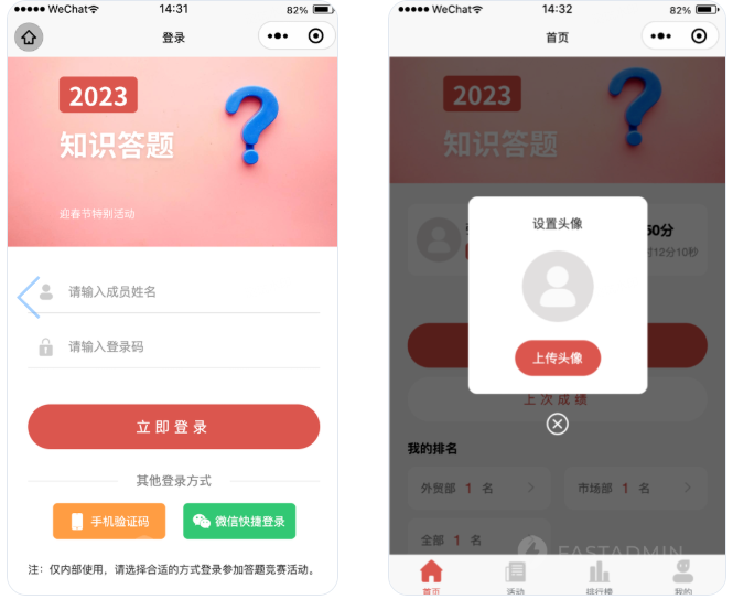 一款适用于企业或组织进行知识答题系统,根据排名进行奖品派发,基于FastAdmin+ThinkPHP+Unipp开发,支持微信小程序和H5方式使用