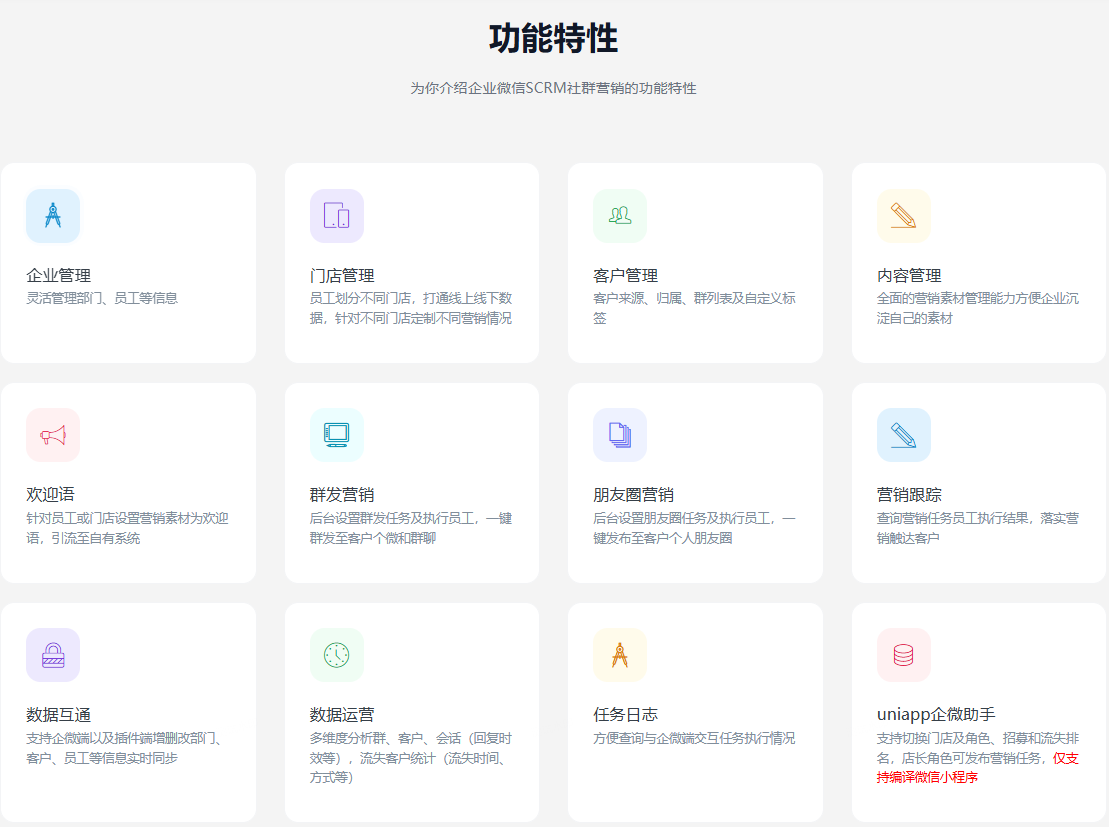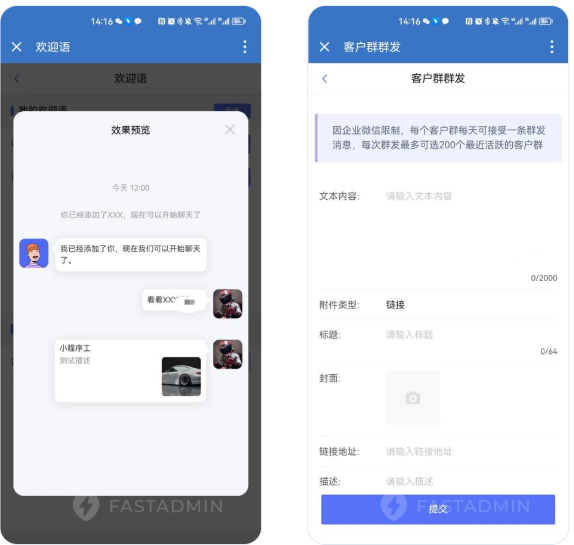 企业微信SCRM是一款基于FastAdmin+Uniapp开发的企业微信社群营销系统,全面助力企业客户营销精准触达,有效沉淀客户。提供Uniapp+后台无加密源代码,支持私有化部署。