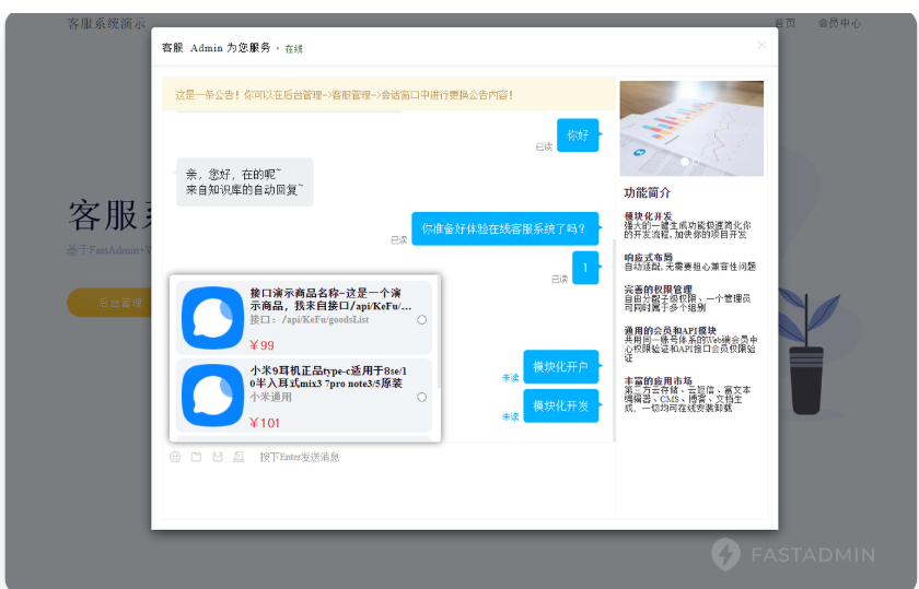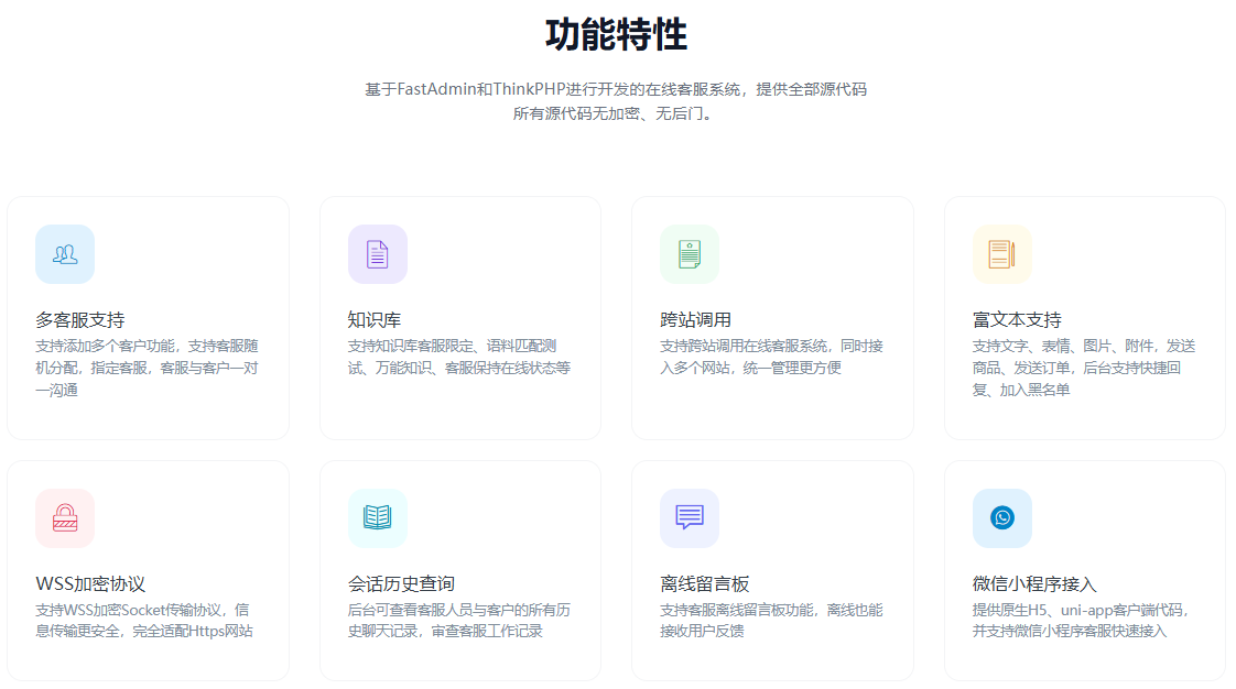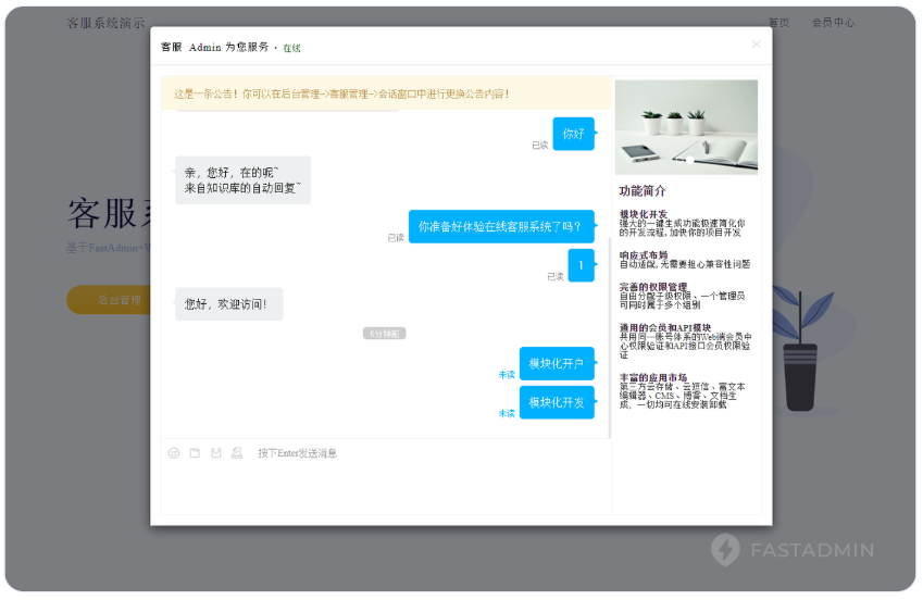 基于ThinkPHP+FastAdmin+Workerman开发的一款实时在线客服系统,支持多客服(不限座席)、知识库、离线留言板、离线消息、历史会话、微信小程序接入、Uni-app接入(高级授权)、用户轨迹等功能。