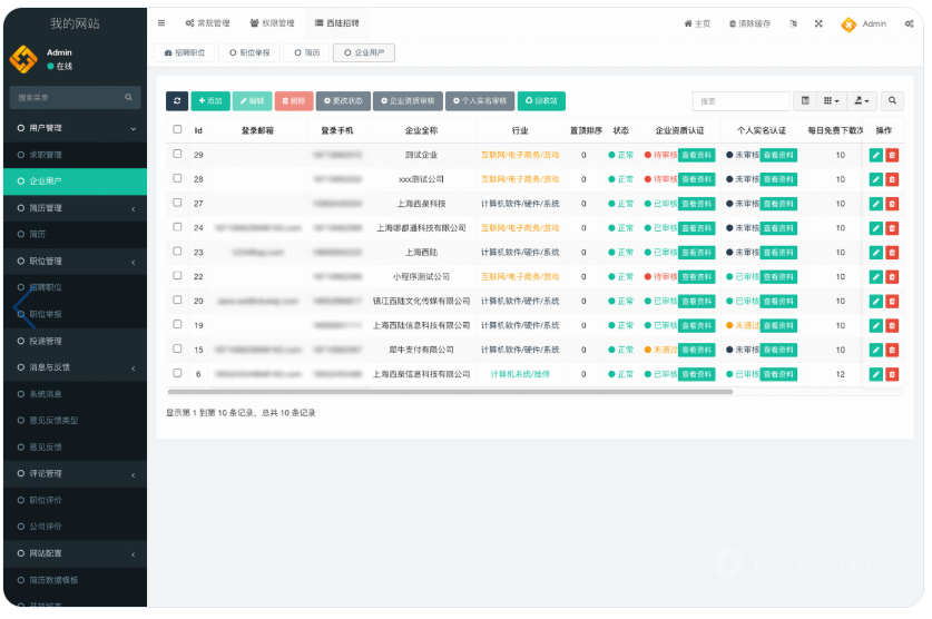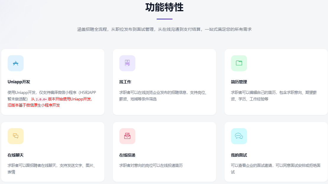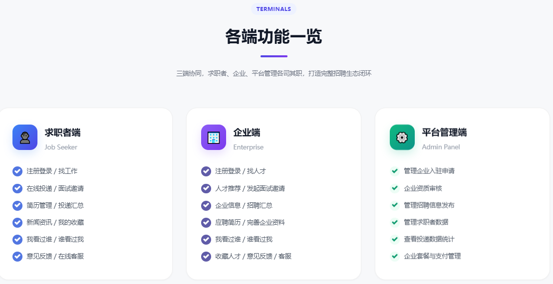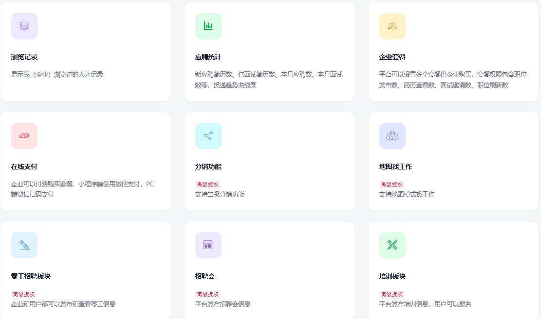 基于ThinkPHP+FastAdmin开发的招聘平台系统,包含微信小程序求职者端、微信小程序企业招聘端、PC企业招聘端、PC管理平台端。提供全部无加密源码,支持私有化部署。