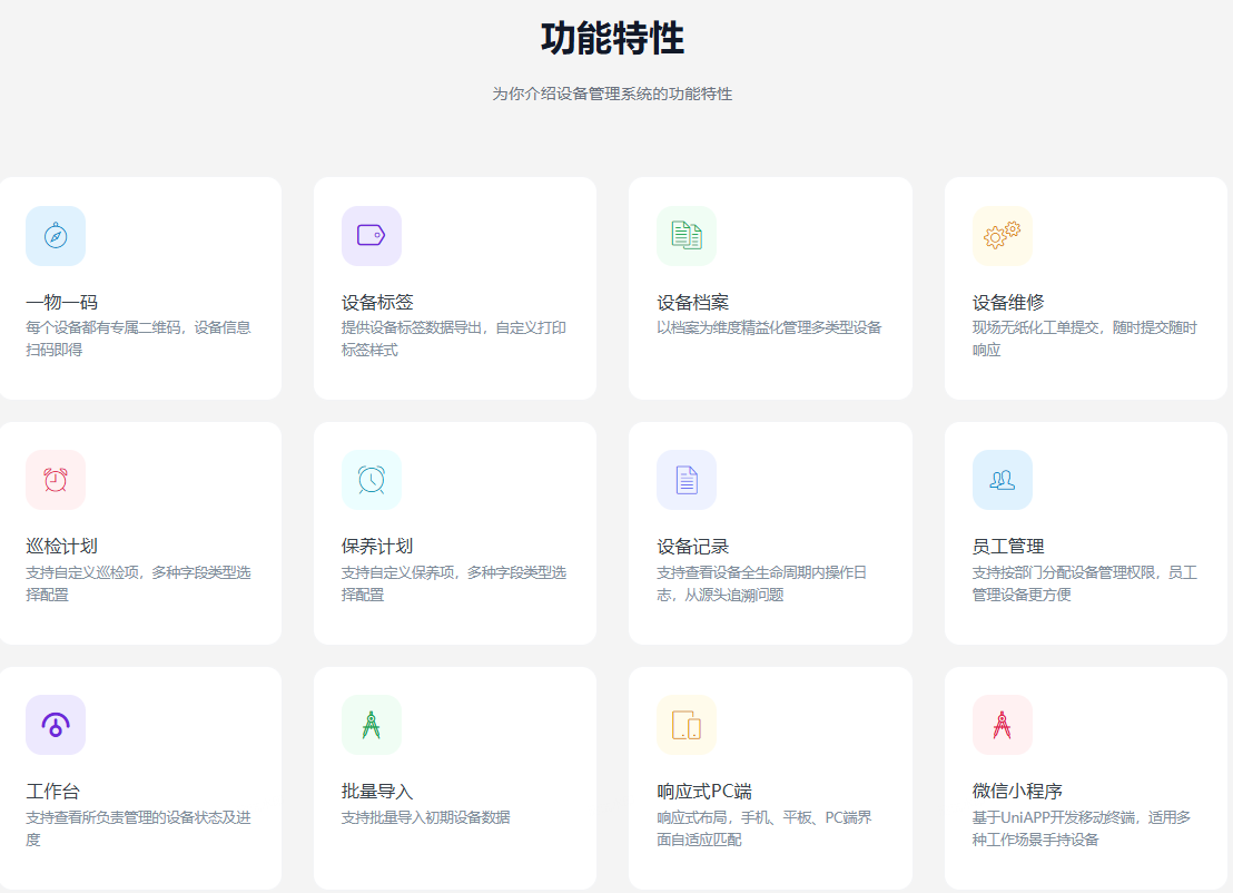 基于ThinkPHP+FastAdmin+UniApp开发的一款工厂设备管理维护系统,支持一物一码、设备标签、设备档案、设备维修、设备巡检、保养计划、员工管理等功能。提供全部无加密源码,支持私有化部署。