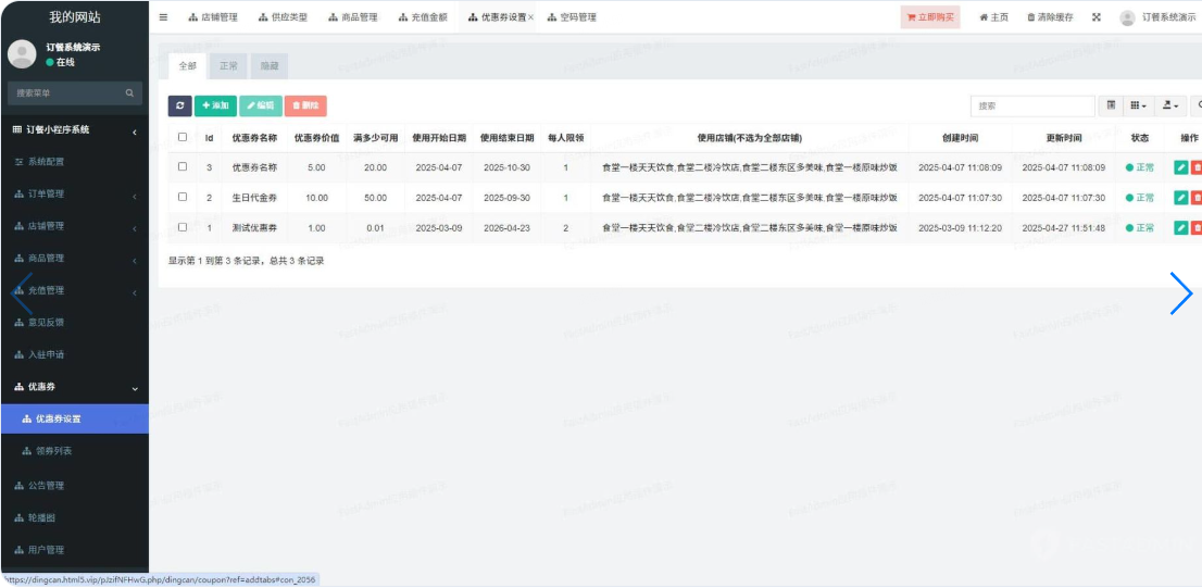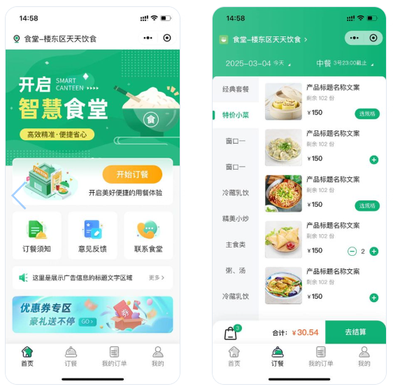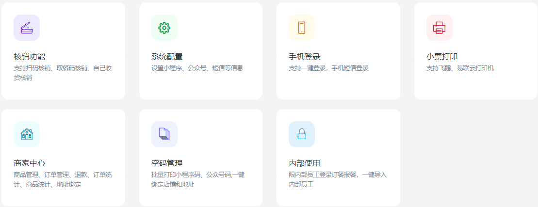 一款基于ThinkPHP+FastAdmin+Uniapp开发的订餐报餐系统,支持微信小程序端、公众号端。支持创建多门店、取餐码核销、商品管理、店铺管理、自定义供应类型、供应时段、供应地址、可限内部员工使用、多端会员统一等。全部无加密服务端和前端源代码,支持私有化部署。 适用场景:餐饮店、内部食堂、工厂、园区、学校、政企、酒店、医院、机场、车站、社区、送货等需要固定地址配送行业,也适用到店消费提前预约的场景。