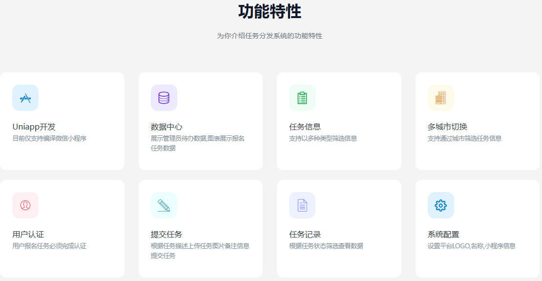 一款基于ThinkPHP+FastAdmin+Uniapp开发的任务分发系统,主要应用于传统销售以及地推客户回访等行业,如传统销售公司需要指定时间按照规定在公司业务合作场地进行拍照核准,方便公司追溯核查记录以及业绩考核。