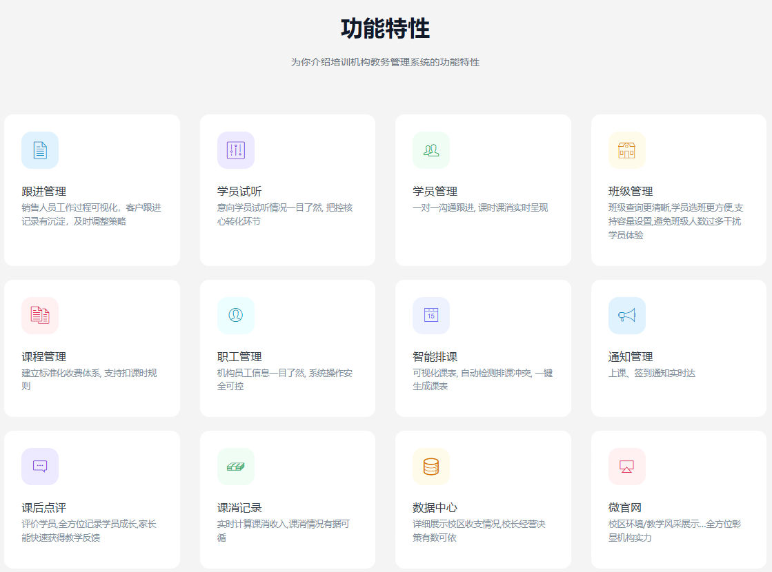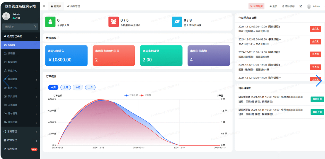 教务管理系统是一款基于FastAdmin+ThinkPHP+Uniapp开发的培训机构教务管理系统。一款专为培训教育机构量身打造的管理系统,集成了招生,试听,排课,课消,上课通知,点名通知,课后点评,数据分析等功能,能帮助教育机构更高效地运营和管理。提供无加密源代码,支持私有化部署。