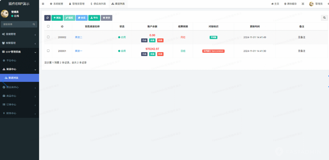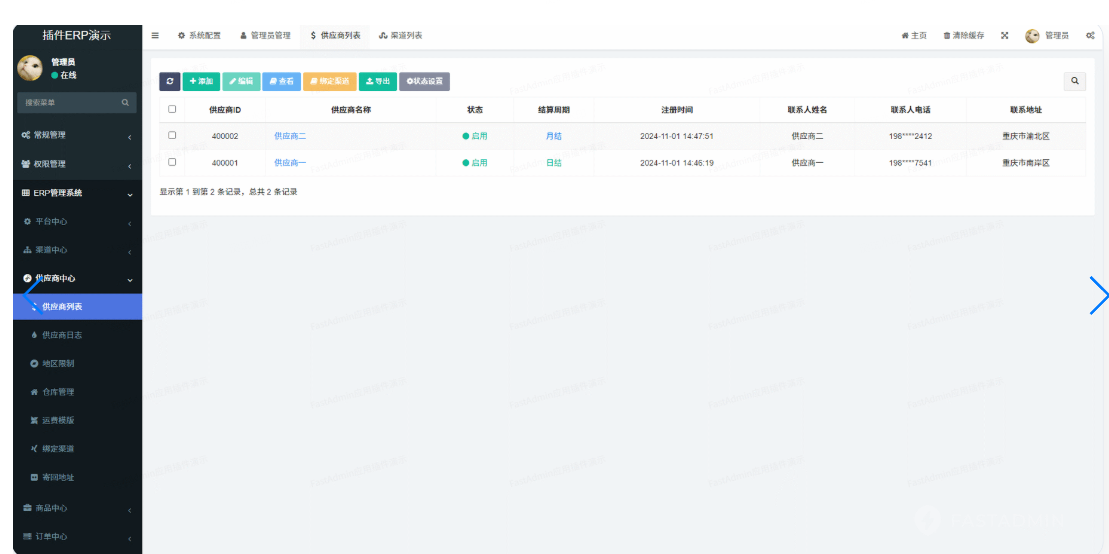 电商供应链ERP管理系统是一款基于FastAdmin+ThinkPHP开发的系统。该系统可满足电商企业管理自身进销存,帮助中小型电商企业管理多个销售渠道、供应商、仓库,并提供商品资料库、商品供货、进销存、订单、售后单、账单结算等功能,适用于各种类型的电商商家。本系统可提供无加密源代码,支持私有化部署。