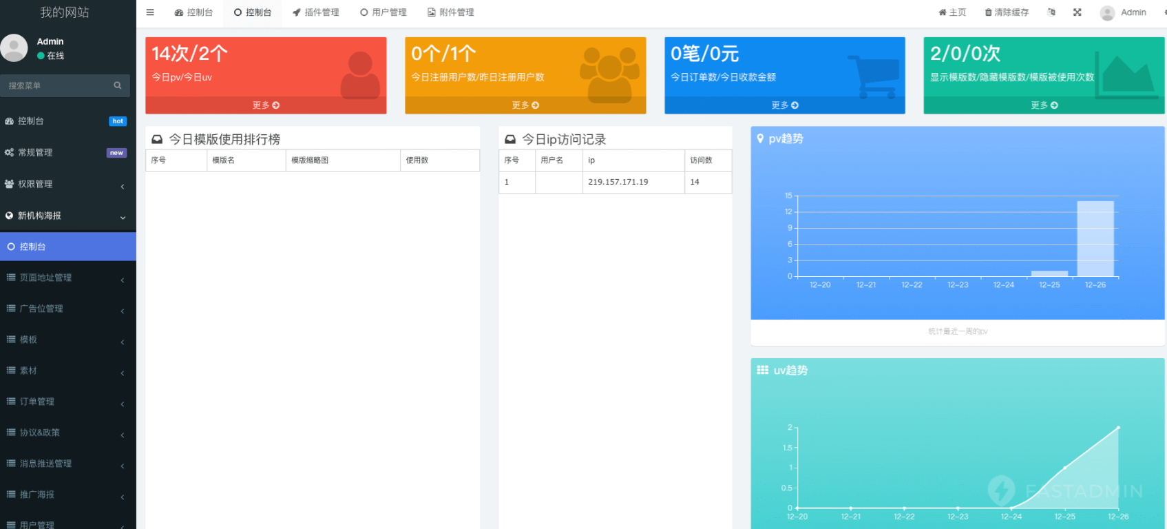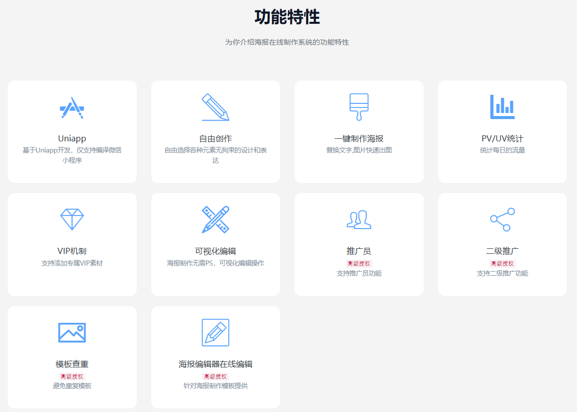 一款基于ThinkPHP+FastAdmin+UniApp开发的海报在线制作系统,本系统不包含演示站中的素材模板资源。