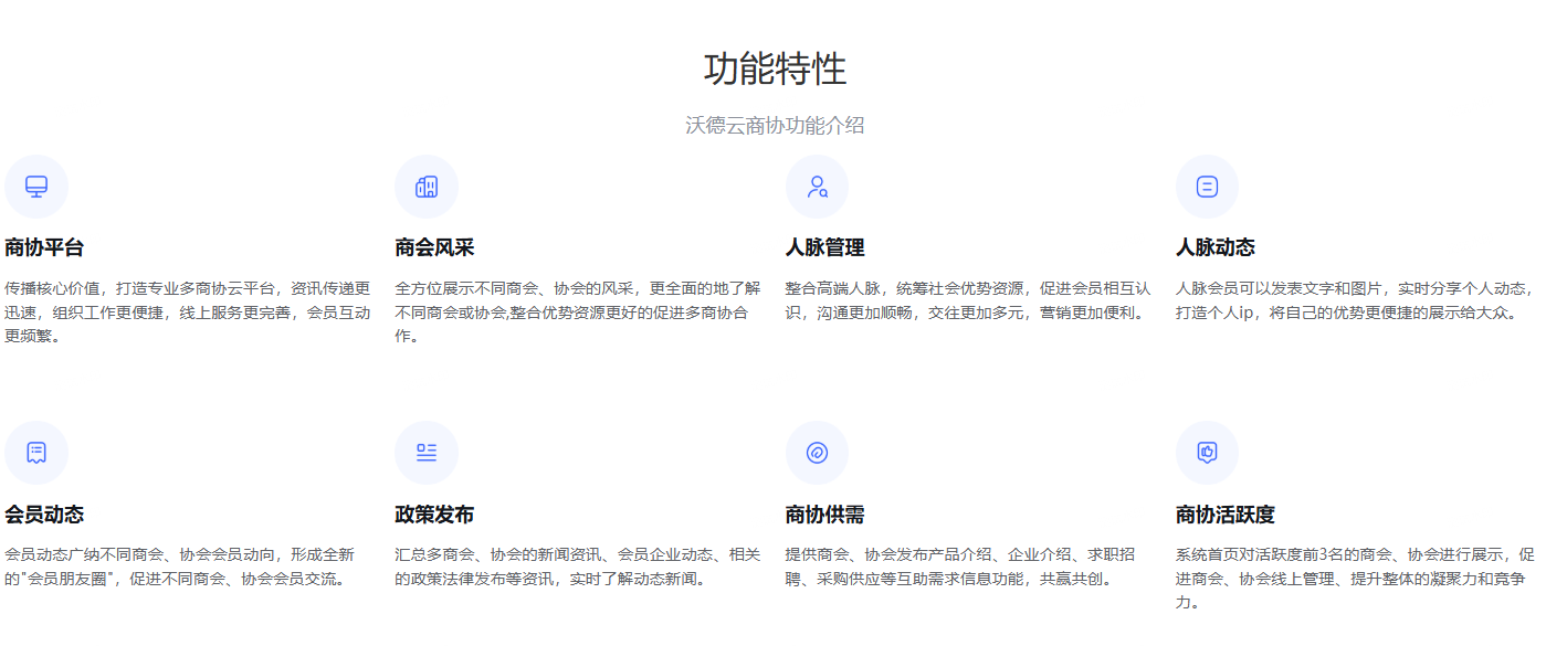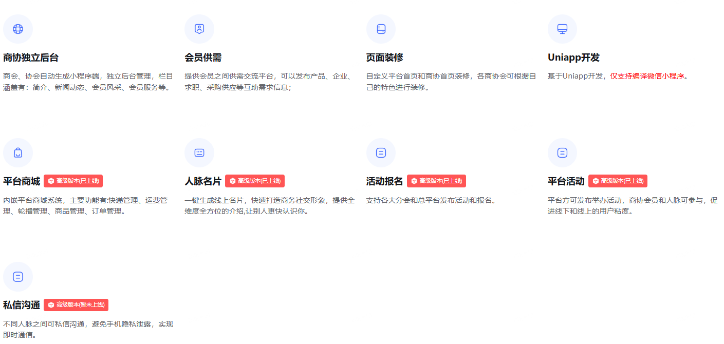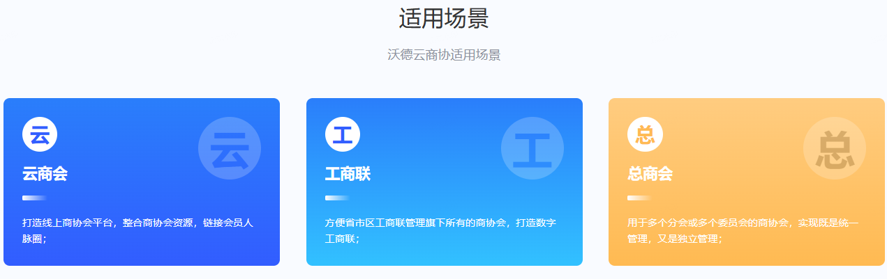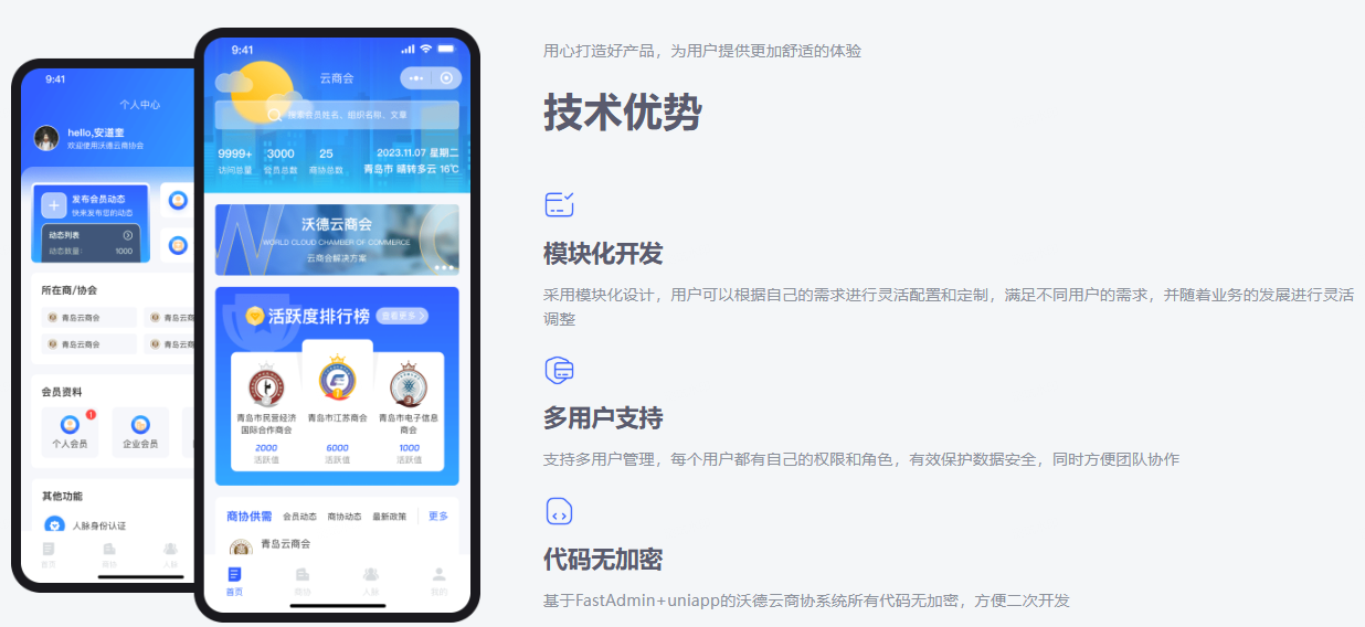 云商协是一款基于FastAdmin+Uniapp开发的“多组织”的云服务平台,打造总商会、总协会、总校友会、工商联等多组织无障碍沟通合作平台,让各大分会、各大分校友会、分组织实现轻松管理,线上宣传展示、商机挖掘、会员管理、会员服务、跨界交流等, 借助沃德云商协平台系统,让总商会、总协会、总校友会、工商联插上互联网的翅膀,更好的服务会员和社会。