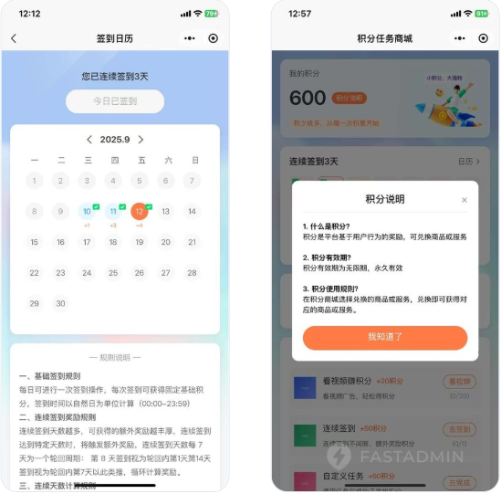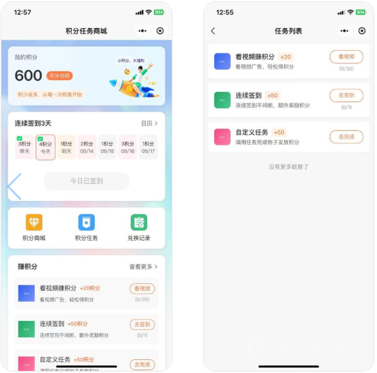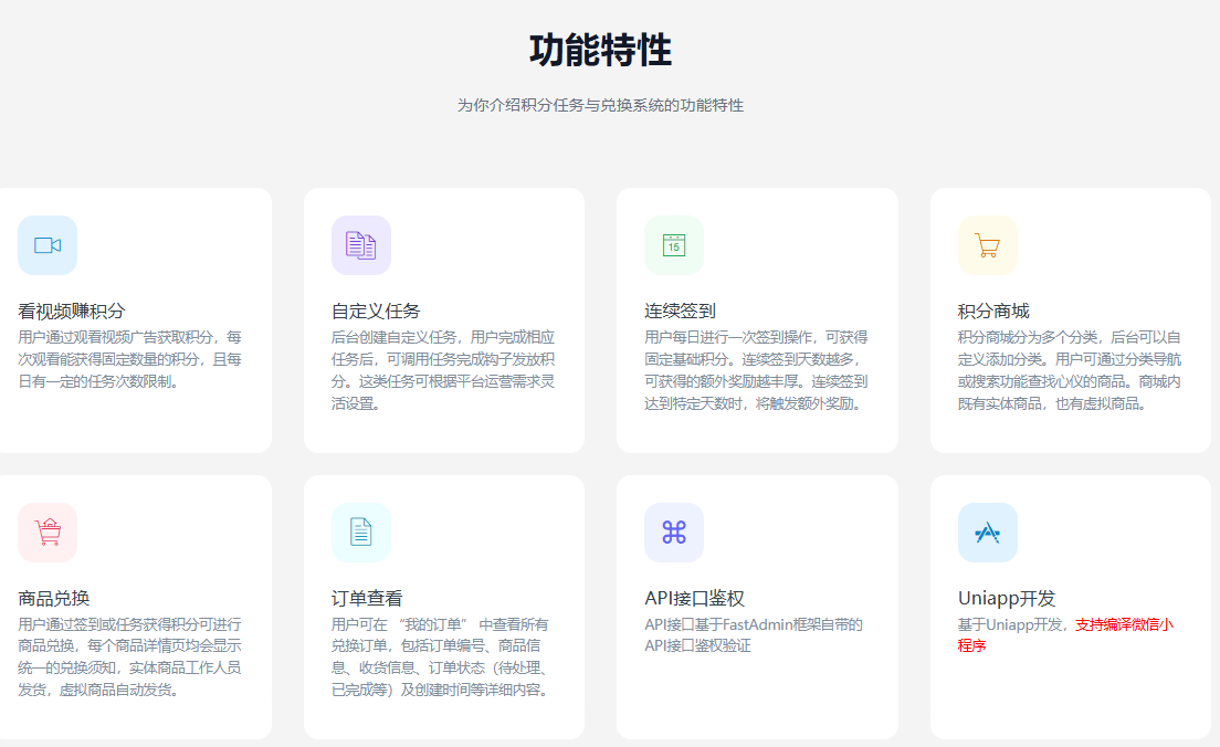 一款基于 FastAdmin 与 Uniapp 开发的集积分获取、积分管理、商品兑换、订单处理及后台管理于一体的积分任务与兑换系统。系统旨在通过多样化的积分获取方式,吸引用户参与平台活动,同时为用户提供丰富的积分兑换选择,提升用户体验与平台活跃度。