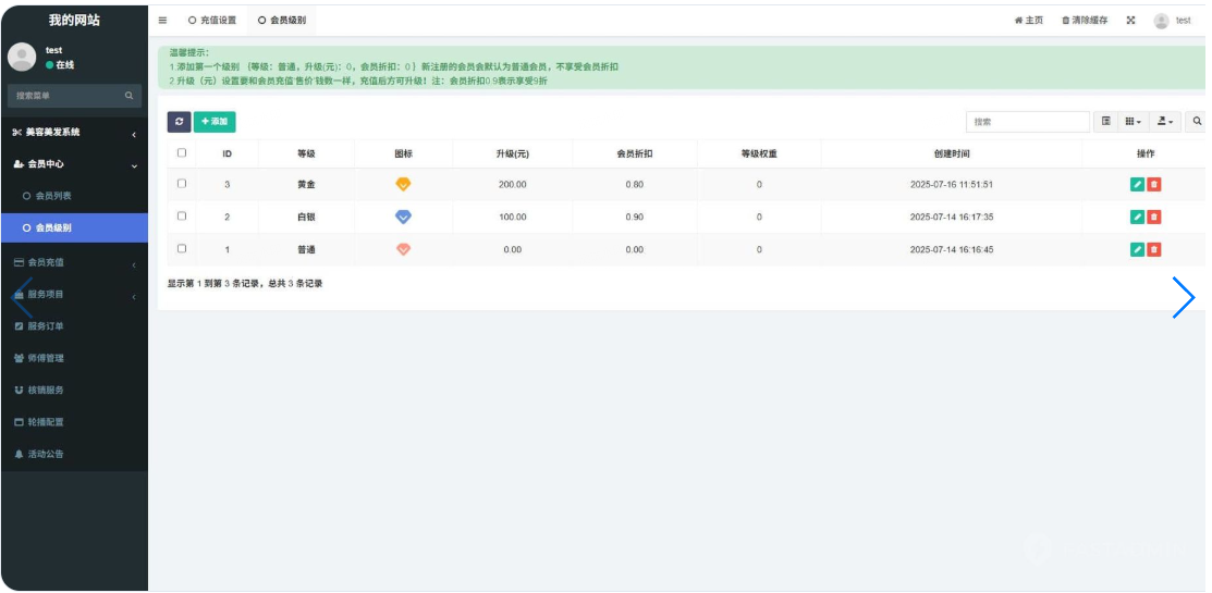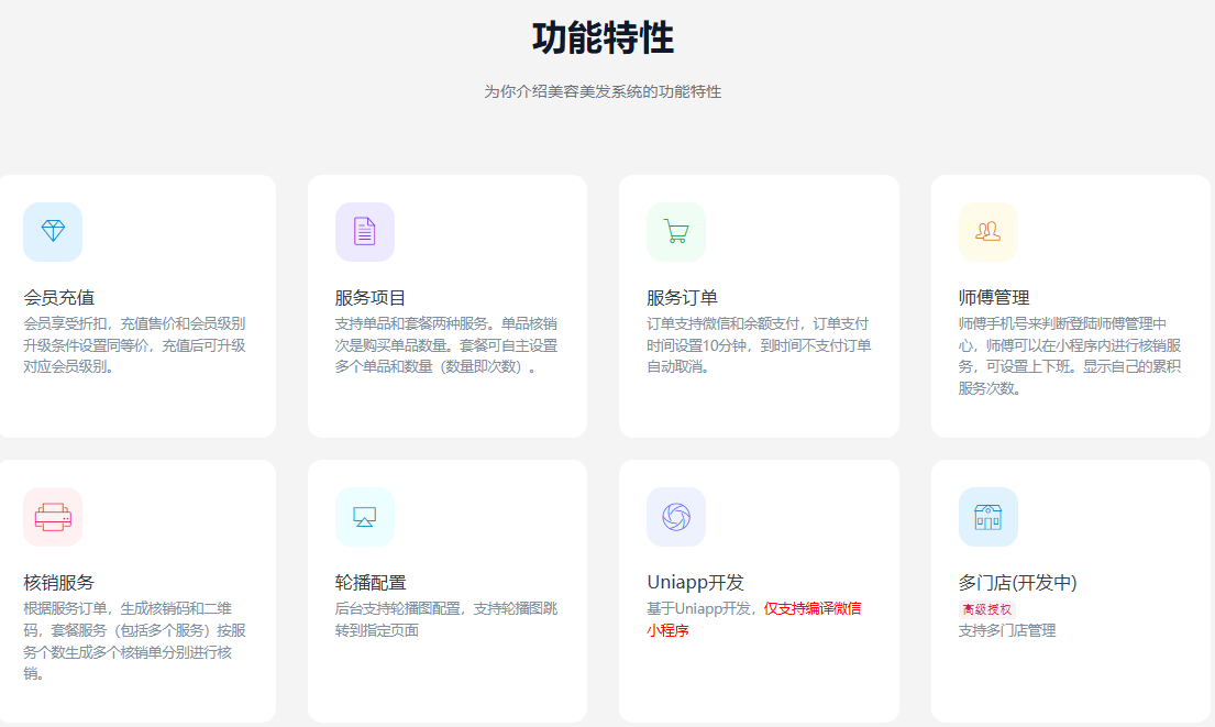 一款基于FastAdmin+UniApp+uView开发的美业小程序系统。可自主设置会员级别,不同级别会员享受不同折扣价。服务项目可设置单品或套餐(次卡),购买服务后生成核销码,支持师傅小程序中扫码核销。可用于美容美发行业办理会员充值优惠卡,服务项目多次套餐优惠,会员出示二维码扫码核销服务,缩短买卖双方交易时间,更好的享受服务。