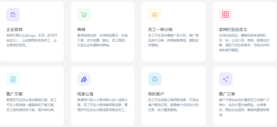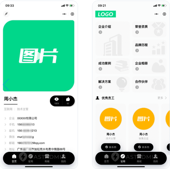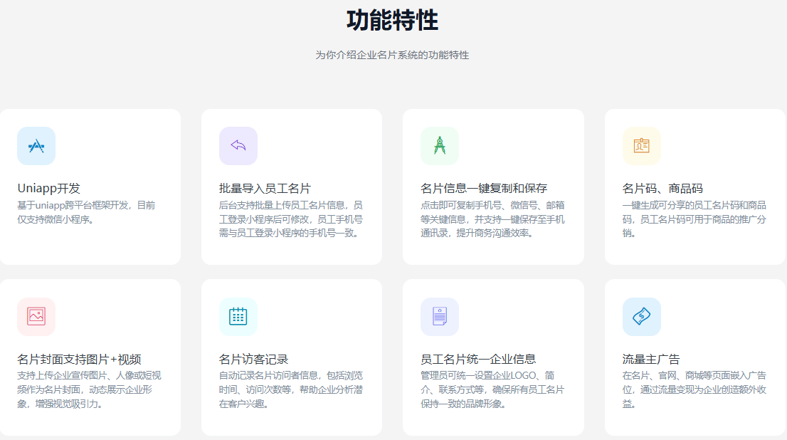 一款基于ThinkPHP+FastAdmin+UniApp开发的企业名片系统,目前仅支持编译微信小程序,支持批量导入员工名片,一键复制/保存信息,生成可分享的名片码和商品码。名片封面支持图片/视频,自动记录访客信息。统一企业信息展示,嵌入流量主广告。集成官网(自定义栏目)和商城功能,支持员工分销提成。提供推广文案、线索公海、客户管理及自动佣金结算,助力企业营销。