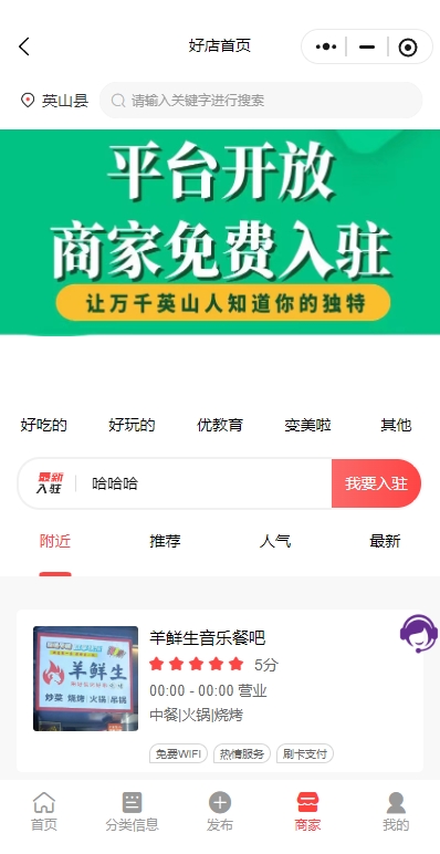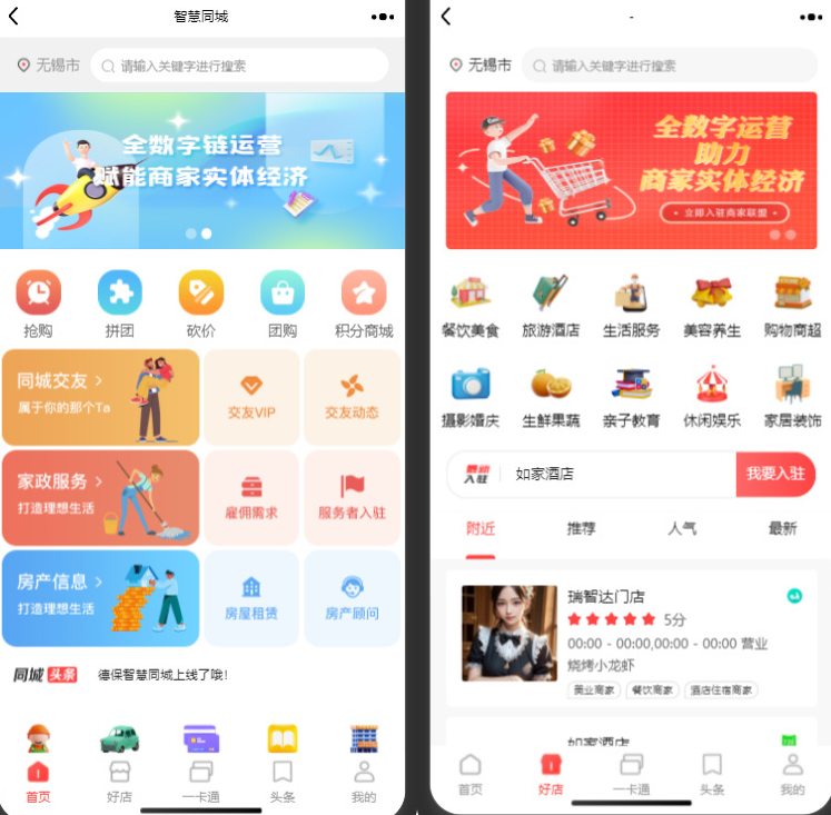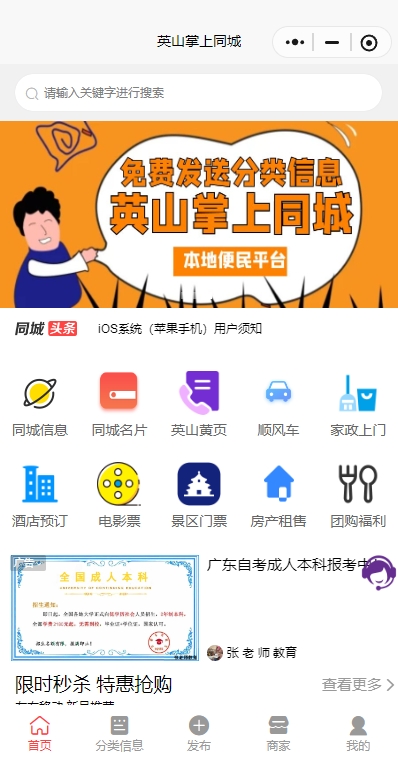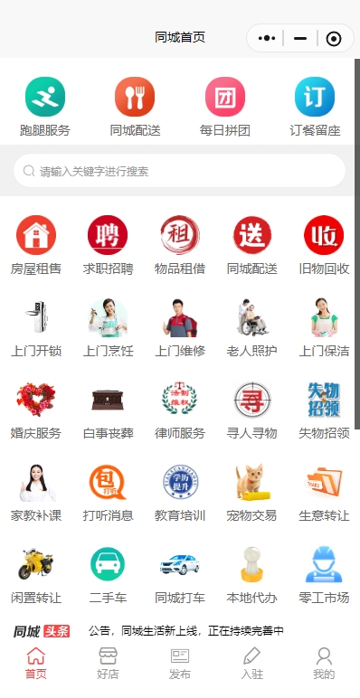程序功能:同城分类信息/同城好店/同城合伙人/同城招聘/同城卡/同城活动/同城优惠抢购/同城商城/同城头条/同城/同城拼团/同城砍价/同城电话本/同城认证/同城签到/同城拼车/同城红包/同城子站点/同城相亲/同城交友 同城小程序/后期升级等模块。