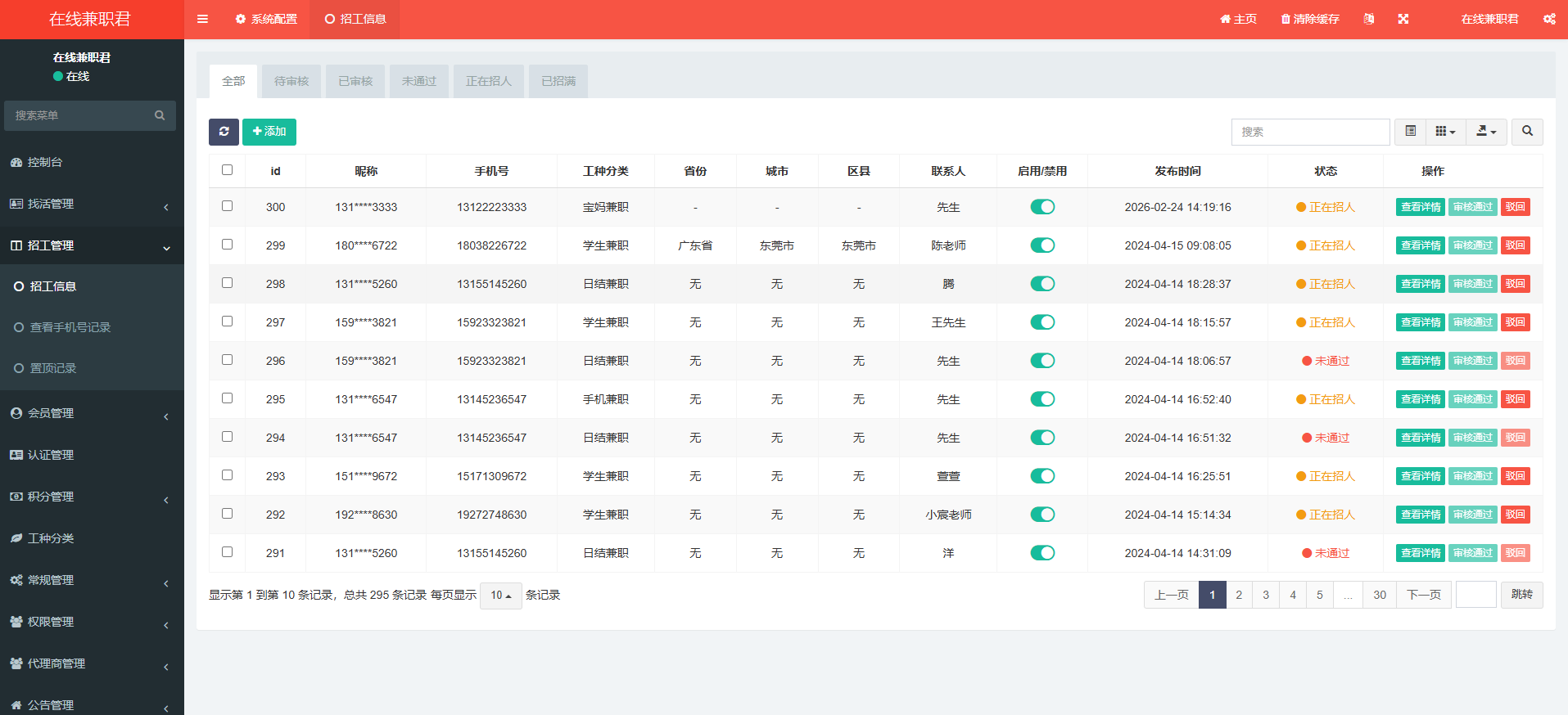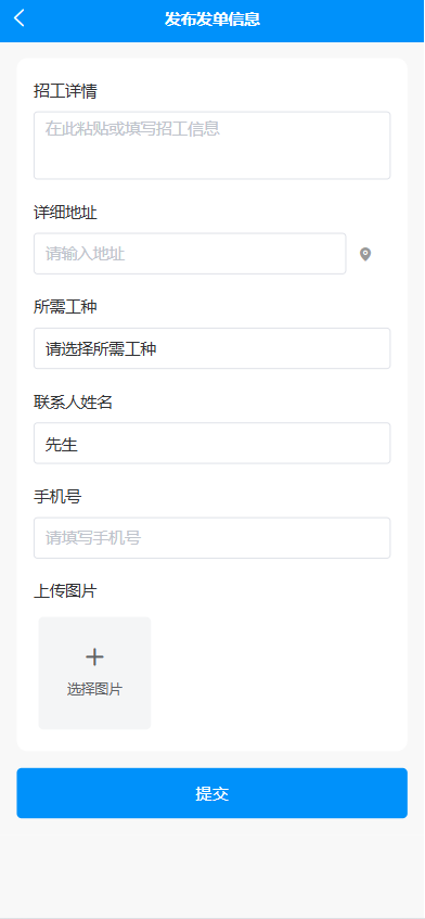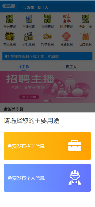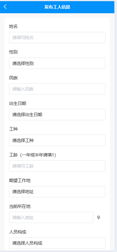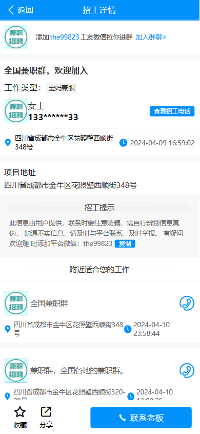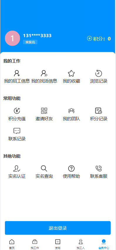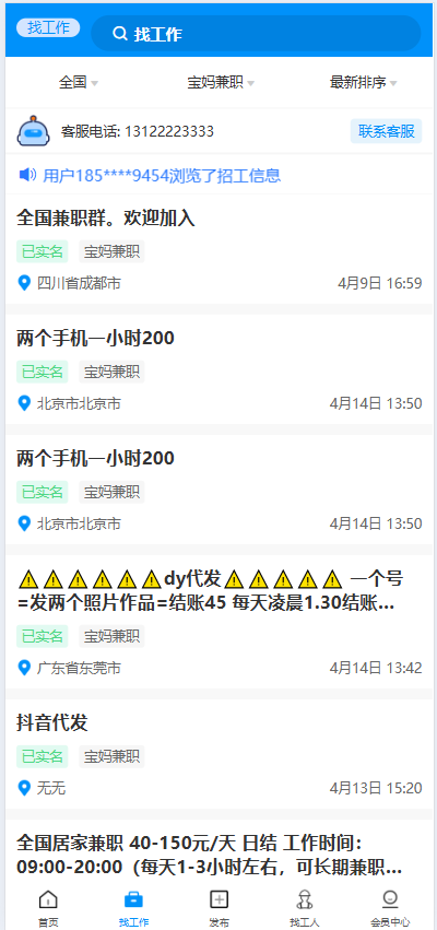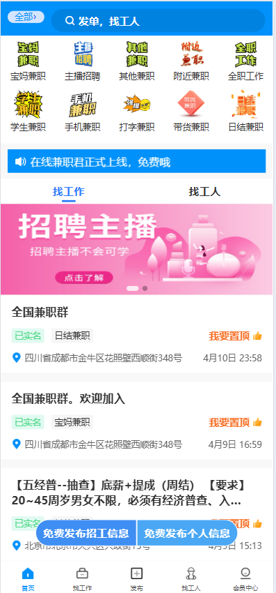 支持会员移动端发布招工、发布找活、置顶信息和实名查询、信息搜索等功能。