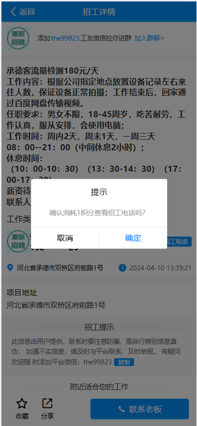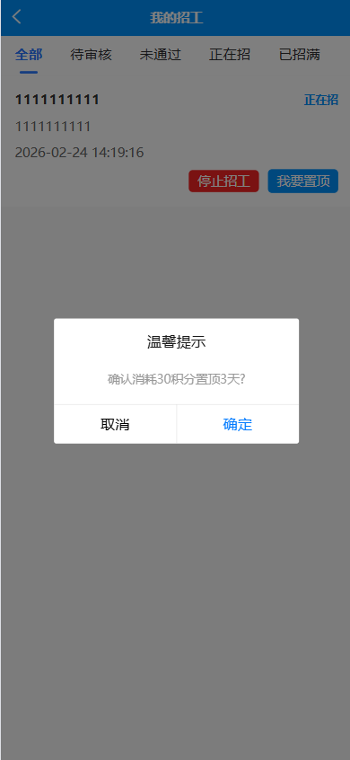 招工小程序主要针对工地招工工人找工作,工地可以发布招工信息,工人可以发布找活信息,招工信息可以置顶,置顶需要积分,积分可以通过签到、分享邀请好友等等
